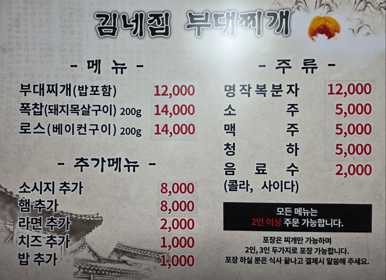 김네집 부대찌개는 브레이크타임이(15:00-17:00) 있기 때문에 방문 시간이 중요합니다.